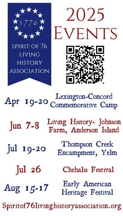 We participate in patriotic parades throughout the year in Western Washington. We also host 18th century living history camps with military demonstrations, including the Encampment on Thompson Creek, St. George's Day Commemorative Encampment, and our 2024 Inaugural Heritage Festival. See our Events Page for more information!